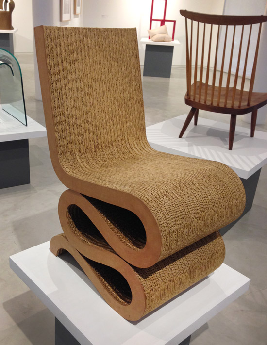I was delighted to see this chair by Frank Gehry. I first read about his foray into cardboard furniture when I read Frank Gehyr: Buildings and Projects back in about 1991. Gehry wrote: My intention was to design the ultimate inexpensive furniture, something that could be sold cheaply and that would be acceptable to a mass market–It was market-tested–and lots of different kinds of people bought it. It reinforced all my feelings about trying to build cheaply in architecture. I knew somewhere there was a key to building inexpensive architecture; uncompromising forms that would be acceptable to the mass market. This chair was built in 1972. It’s made from 60 layers of corrugated cardboard with hidden screws and fiberboard edging.